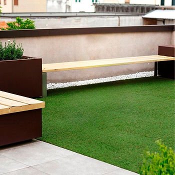 A grama sintética harmoniza com madeira e fibras naturais, criando um ambiente cheio de conforto e vida.