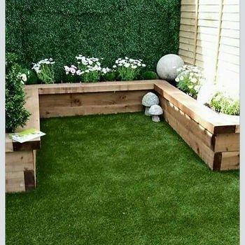 Junte a grama sintética a móveis de madeira e uma churrasqueira portátil para um espaço funcional e convidativo.